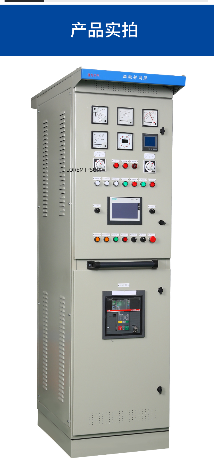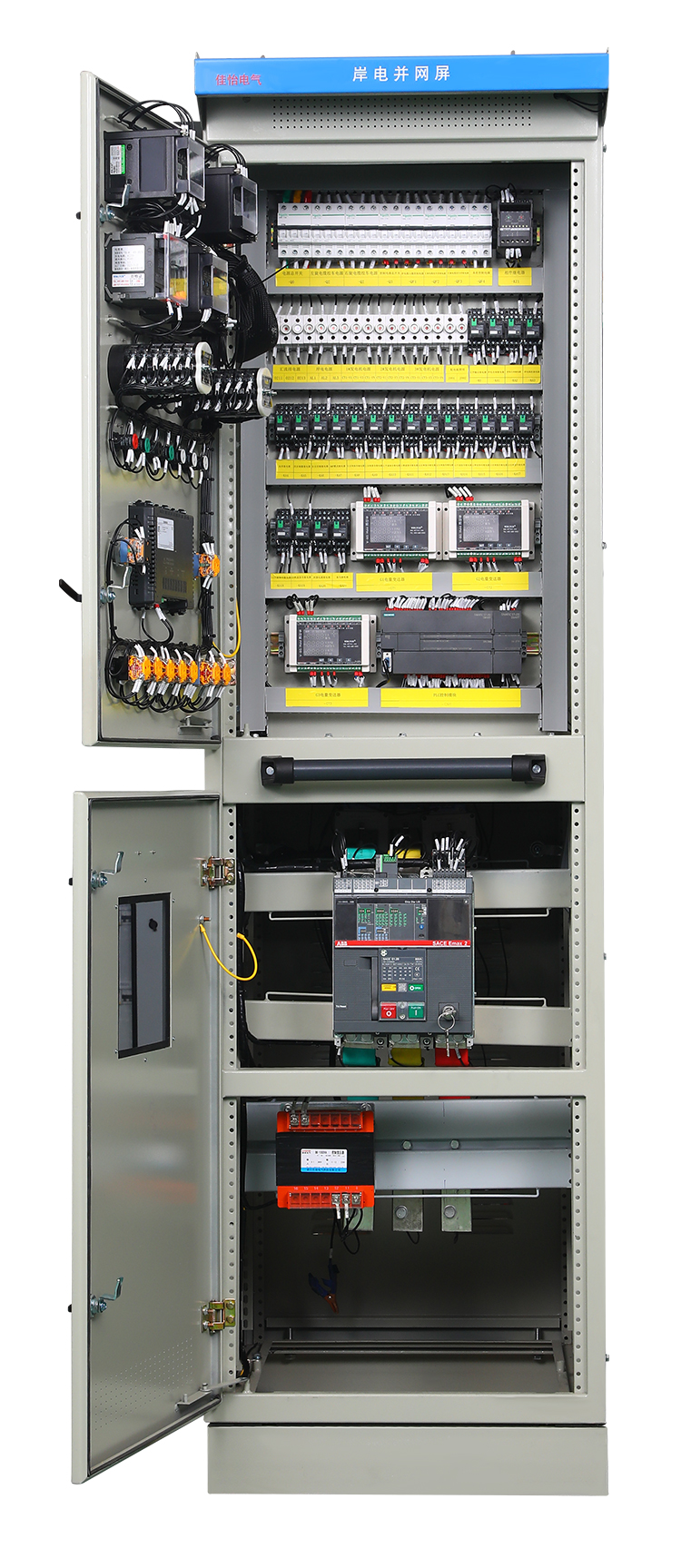 岸电并网屏多用于岸电改追项目,由于国家环保要求,要求大型船舶靠港时,不能用发电机发电,需要接岸电,实现岸电与船电的全自动并网,不断电自动负互转移。